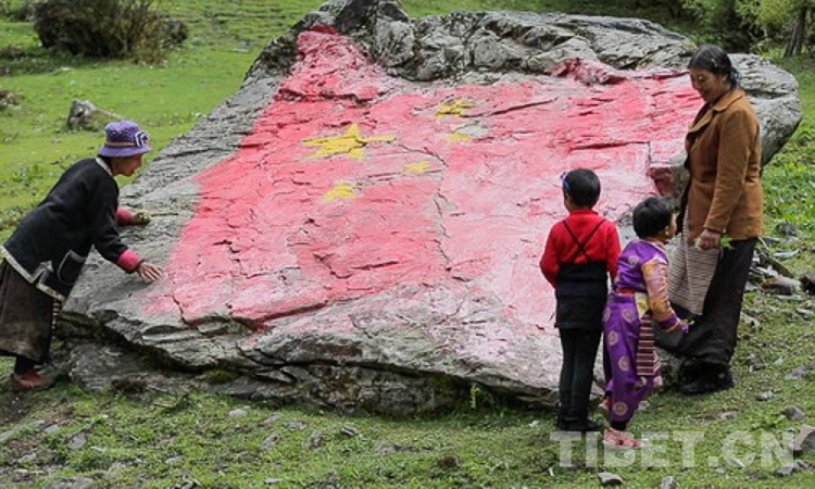 圖為卓嘎(左一)和央宗(右一)在巨石繪制的國旗旁 攝影:趙耀