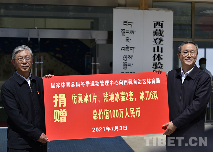 中國西藏網(wǎng)訊 7月3日,國家體育總局冬季運(yùn)動(dòng)管理中心向西藏自治區(qū)體育局捐贈(zèng)物資儀式在拉薩市舉行。西藏自治區(qū)體育局獲贈(zèng)仿真冰、陸地冰壺、冰刀等總價(jià)值100萬元的設(shè)施設(shè)備,助力冬季運(yùn)動(dòng)項(xiàng)目發(fā)展。