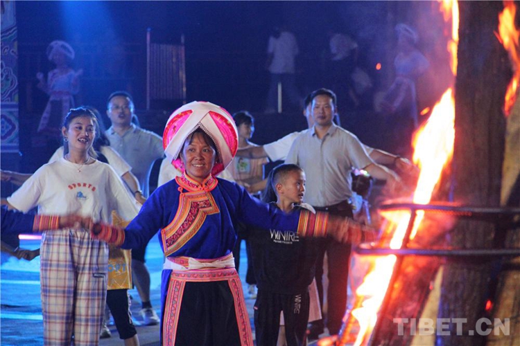 中國西藏網(wǎng)訊 當(dāng)陣陣涼風(fēng)襲來,暑氣漸消,暮靄沉沉。碧水青山環(huán)抱的阿妹戚托小鎮(zhèn)卻漸漸躁動(dòng)起來,熱騰的火苗將夏夜“點(diǎn)燃”,人們環(huán)繞火把載歌載舞、歡唱高歌,沉醉其中、樂而忘返。