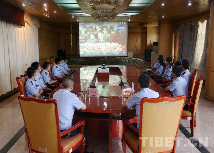 圖為西藏出入境邊防檢查總站執(zhí)法調查支隊廣大民警收聽收看慶祝西藏和平解放70周年大慶直播盛況