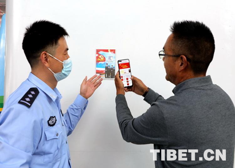 圖為民警向當?shù)馗刹拷榻B黨史“碼”上學