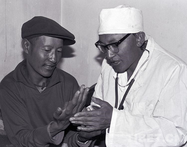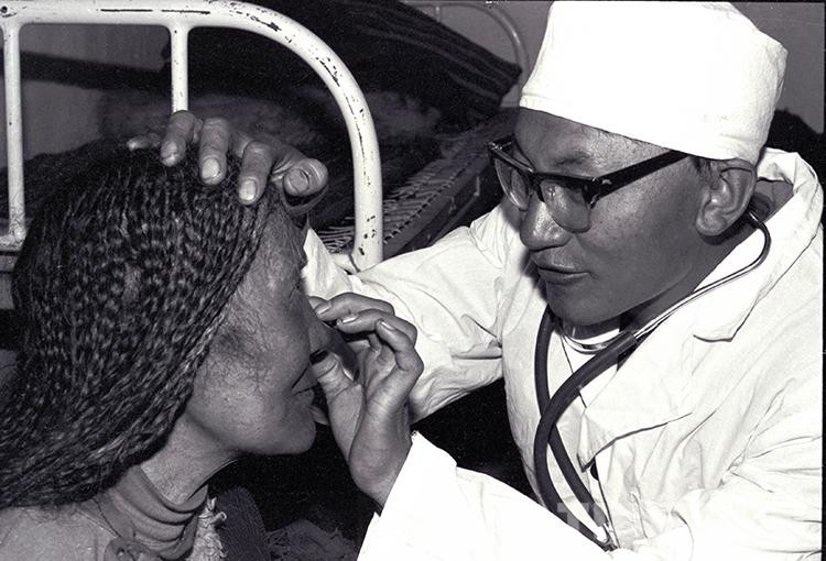這是文部辦事處(現(xiàn)尼瑪縣)衛(wèi)生院院長羅桑多吉正在為住院牧民患者診治眼睛疾?。ㄌ普倜?987年攝)