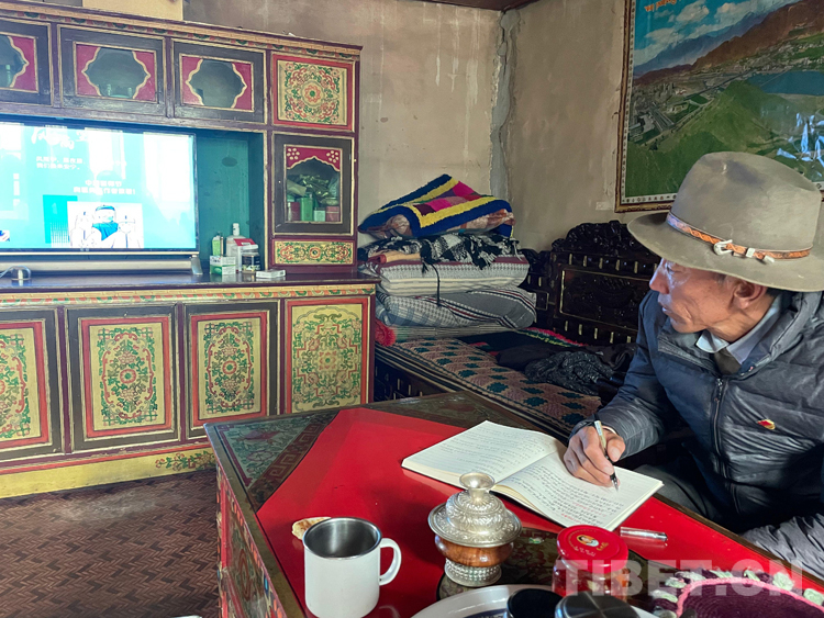 圖為索朗頓珠收聽(tīng)收看時(shí)政新聞