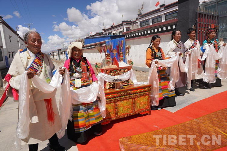 位于薩迦縣扯休鄉(xiāng)東北部的嘎吉林村,是庫區(qū)搬遷新村,2020年3月,全村139戶769人從海拔4000多米的土坯房搬遷到了這里海拔3800米的新房。得知班禪要來的喜訊,嘎吉林村村民及信教群眾身著節(jié)日盛裝、手捧潔白哈達,一早就自發(fā)聚集在村廣場上迎候班禪。村民旦珍高興地對記者說道:“自從搬到這兒以后,政府給我們每人分了5.5畝田地,每戶人家都享受著國家搬遷優(yōu)惠政策,住上了福利幸福房。尤其是有了村里的集體合作社,再也不用像以前那樣單打獨斗各家做各自的事了?,F如今,無論是生活還是經濟收入都一年比一年好?!?/p>