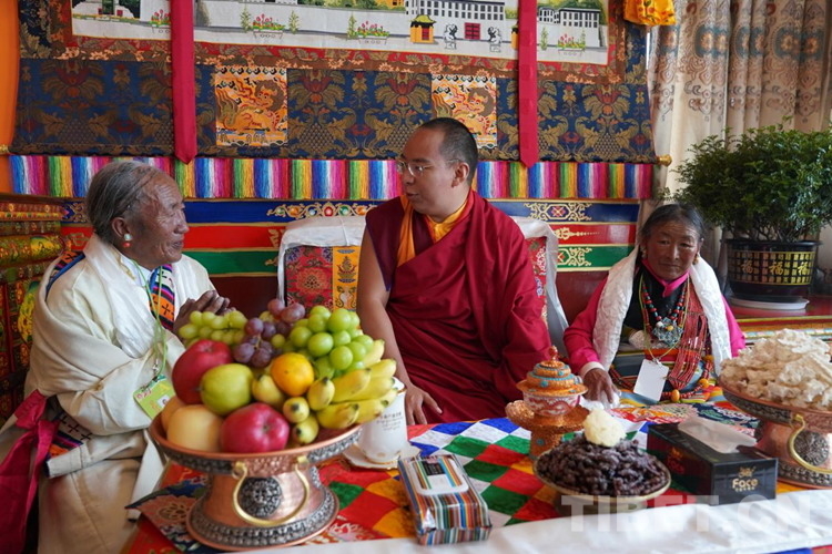 中午時分,班禪結束了對拉洛水利的調研,到扯休鄉(xiāng)嘎吉林村看望搬遷群眾,熱情的村民迎上前來向班禪獻上哈達和切瑪,班禪高興地揮手致意。班禪緩步來到村民歐珠老人家。班禪為家里的老人摸頂賜福,端坐在歐珠家人當中,詳細詢問搬遷后的生產生活情況。得知歐珠老人一家在搬遷后住房條件、生活條件等都有顯著改善,班禪感到十分欣慰。