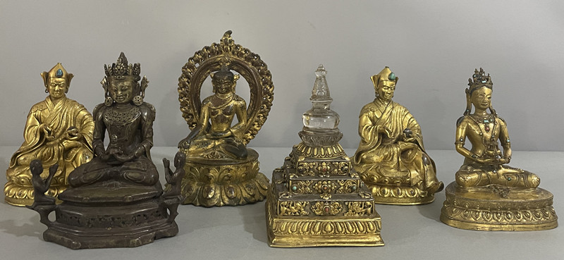 其中,5件金銅佛造像和1件銅鎏金水晶嵌寶石供養(yǎng)塔制作工藝精良,專家建議暫定為三級(jí)文物。特別是1尊明末清初的黃銅同侍從無(wú)量壽佛造像,呈現(xiàn)出顯著漢藏融合風(fēng)格,其六面形臺(tái)座多見于漢藏風(fēng)格唐卡與壁畫,在銅造像中較為罕見。