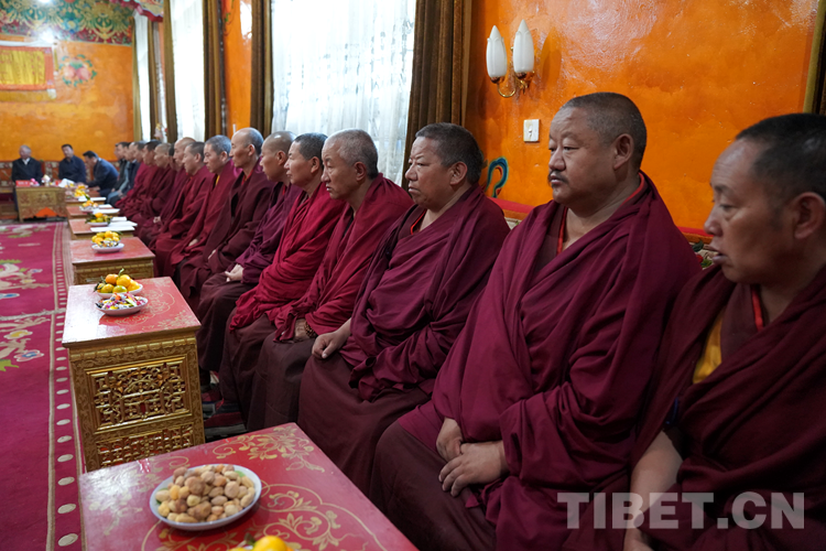 張延清說,今年,在中國共產(chǎn)黨成立100周年,西藏和平解放70周年之際,習近平總書記作為中共中央總書記、國家主席、中央軍委主席到西藏慶祝西藏和平解放,在黨和國家歷史上是第一次,充分體現(xiàn)了以習近平同志為核心的黨中央對邊疆地區(qū)的深情牽掛、對西藏工作的高度重視、對西藏各族干部群眾的深厚感情。7月22日下午,習近平總書記來到建寺600多年的哲蚌寺,受到了全寺僧人最高禮遇的迎接。習近平總書記充分肯定了哲蚌寺在擁護中國共產(chǎn)黨、擁護社會主義制度、維護祖國統(tǒng)一等方面做出的積極貢獻,并關(guān)心詢問僧人身體狀況特別是老年僧人健康問題,在場的僧人都很感動??v觀世界,國家領(lǐng)導(dǎo)人如此高度重視宗教工作、如此深情關(guān)懷宗教界人士,唯有中國、唯有中國共產(chǎn)黨的領(lǐng)導(dǎo)人。知恩、念恩、感恩、報恩是菩提心的根本。各位僧人朋友們一定要按照習近平總書記的指示精神,守法敬業(yè)、愛國愛教、潛心修行、向善為民、利益眾生,真正做慈悲為懷的真佛子。