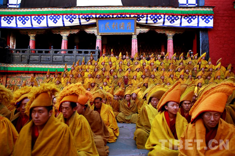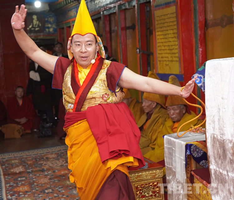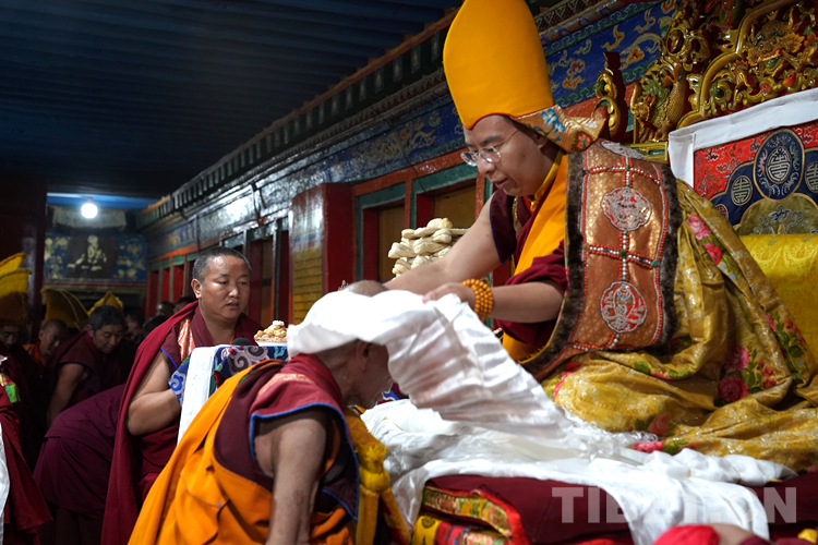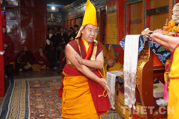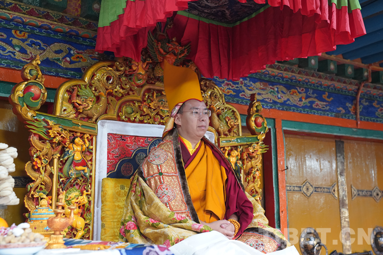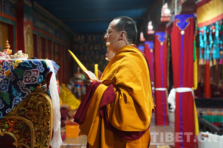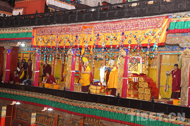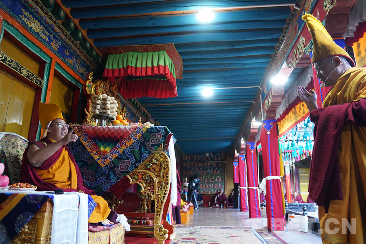 27日(藏歷9月22日),扎什倫布寺舉行祝賀班禪獲得嘎欽學位吉祥祈愿法會。班禪向在場所有僧眾摸頂賜福,并與僧眾集體誦經,回向祈福饒益眾生、法務昌隆、國泰民安、風調雨順。
