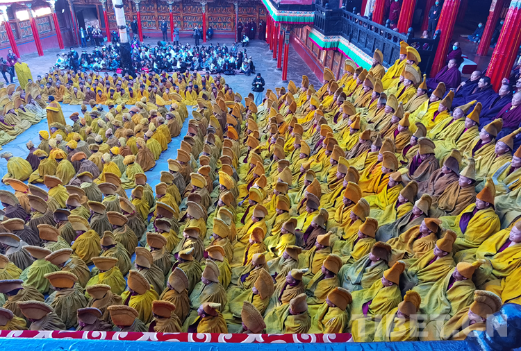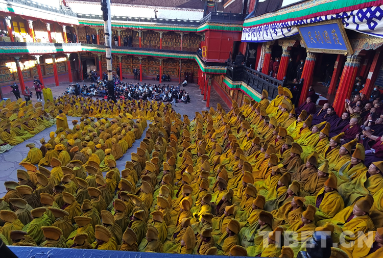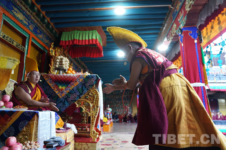 經過數(shù)日準備,26日下午,班禪于扎什倫布寺參加嘎欽學位立宗答辯。來自西藏自治區(qū)藏傳佛教各教派的堪布、經師等高僧以及扎什倫布寺僧眾、信教群眾等800人共赴盛會、共享法喜。