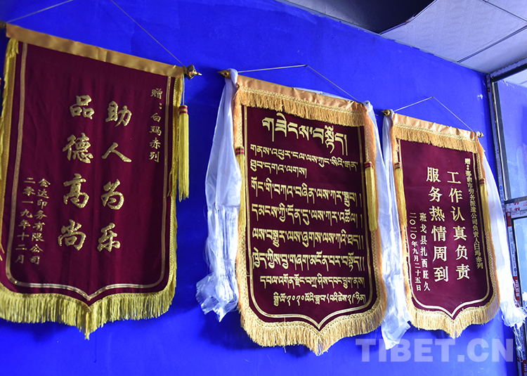 圖為白瑪赤列的勞務(wù)派遣公司里大家贈(zèng)送的錦旗 攝影:王媛媛