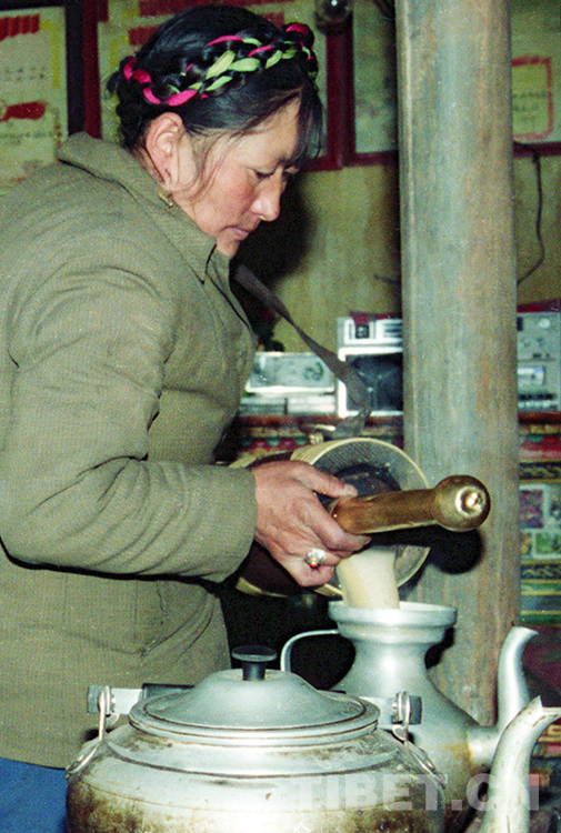 然后,她們又將煮好的濃茶,與酥油一道潷入另一個(gè)木制小酥油桶里,雙手握著長(zhǎng)長(zhǎng)的木塞,打起酥油茶。直到桶內(nèi)聲音從“咣當(dāng)、咣當(dāng)”變成“嚓伊、嚓伊”時(shí),茶、酥油、鹽等即混為一體,酥油茶便打好了。一天所需的酥油茶制作完工后,再去做其它事情……