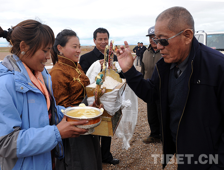 這是那曲地區(qū)雙湖特別區(qū)(現(xiàn)那曲市雙湖縣)的青年在向來(lái)訪的老領(lǐng)導(dǎo)洛桑丹珍敬青稞酒(唐召明2013年7月25日攝)