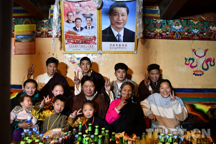 “尼瑪,拉姆,快過來獻哈達了!”索朗仁青一邊招呼著自己的孫子、孫女,一邊整理著手中的哈達。“向領袖獻哈達是我們家每年不變的傳統(tǒng),我們永遠感謝偉大領袖,感謝共產(chǎn)黨?!彼骼嗜是嘁患仪f嚴面向墻上懸掛的領袖像,高舉哈達,齊聲祝福:“扎西德勒!”