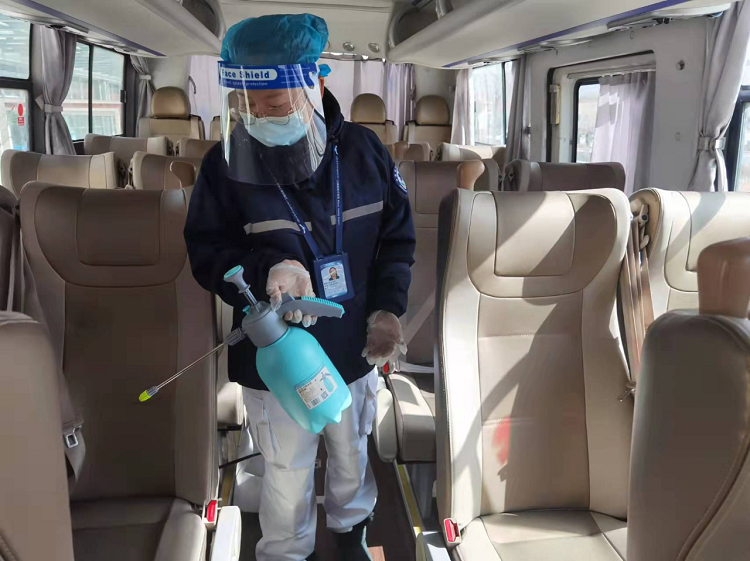 圖為達(dá)娃央金醫(yī)生在對旅客班車進(jìn)行消毒