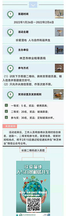 記者從“林芝林業(yè)”微信公眾號(hào)獲悉,為廣泛宣傳普及濕地保護(hù)知識(shí),提升公眾濕地保護(hù)意識(shí),進(jìn)一步激發(fā)廣大群眾參與濕地保護(hù)和生態(tài)文明建設(shè)的熱情,西藏自治區(qū)林芝市特意在第26個(gè)“世界濕地日”來(lái)臨前開(kāi)展了“世界濕地日”有獎(jiǎng)答題活動(dòng)!