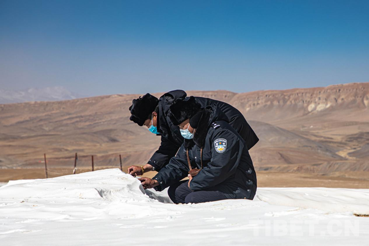 到達(dá)踏查點,那里有一個由大小差不多的石頭壘起來、高50厘米左右的半圓形石堆,這就是他們踏查的避風(fēng)港。普瓊手執(zhí)國旗佇立在石頭上,嘎色拿出胸前的望遠(yuǎn)鏡,觀察四周有無異樣。風(fēng)不停地襲擾,但他們就像雕塑一樣,誓死捍衛(wèi)著腳下的領(lǐng)土。