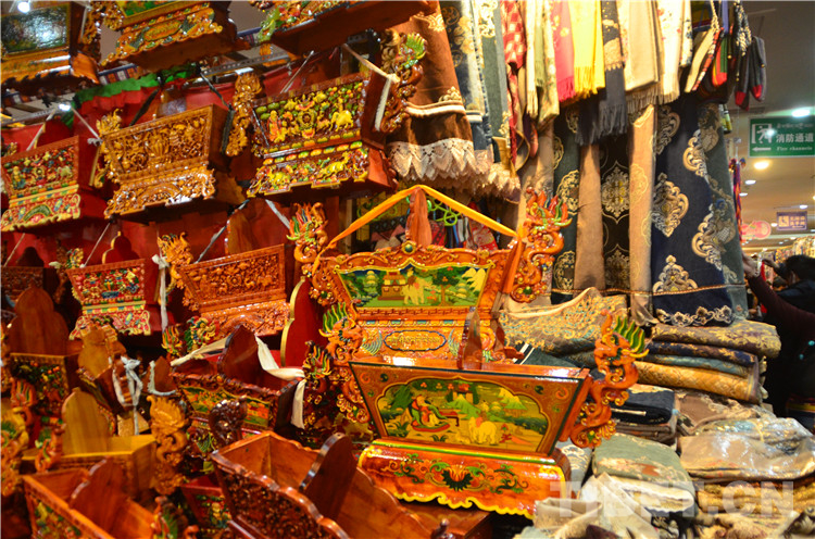 商城一層是一個(gè)年貨市場(chǎng),一層一層壘起來(lái)的切瑪盒、不同顏色和形狀的卡塞、堆成寶塔形狀的紅糖、花盆里裝著的青稞苗……在那拿出皮尺量的,是在購(gòu)買香布,藏歷新年到來(lái)時(shí)家家戶戶都會(huì)更換新的香布。