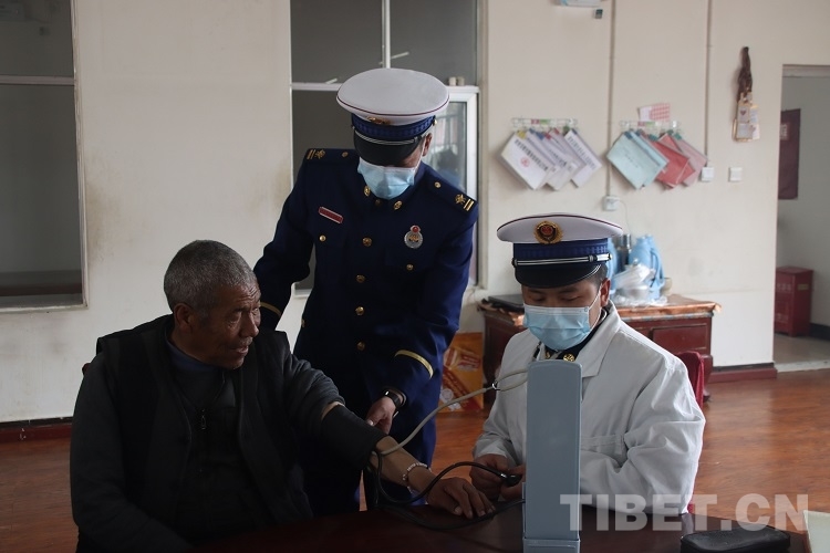 圖為林芝市森林消防支隊波密中隊隊員為福利院老人測量血壓