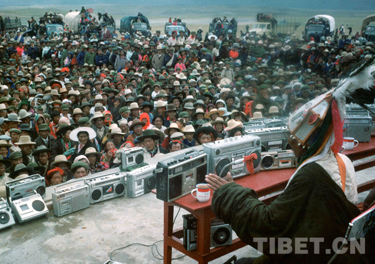 1987年盛夏的一天,藏北草原首府那曲鎮(zhèn)正在舉行一年一度的傳統(tǒng)賽馬會。只見這里各色帳篷林立,人山人海,商品交易繁忙。我遠遠看到,在一片寬廣的草地上,成百上千的觀眾盤腿坐著,靜聽露天舞臺上一個頭戴彩帽的人在比劃著什么。