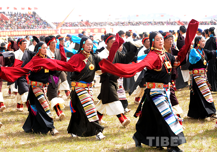 這是在藏北首府那曲鎮(zhèn)賽馬會上,牧民群眾所跳的大型“鍋莊”舞(唐召明2013年8月10日攝)