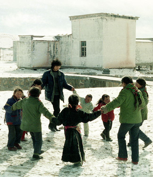 這是青藏公路線上的唐古拉山道班小學師生,在課間活動中跳起“鍋莊”舞(唐召明1990年攝)