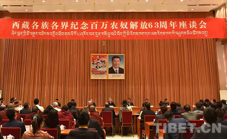圖為西藏各族各界紀(jì)念百萬農(nóng)奴解放63周年座談會現(xiàn)場 攝影:王媛媛