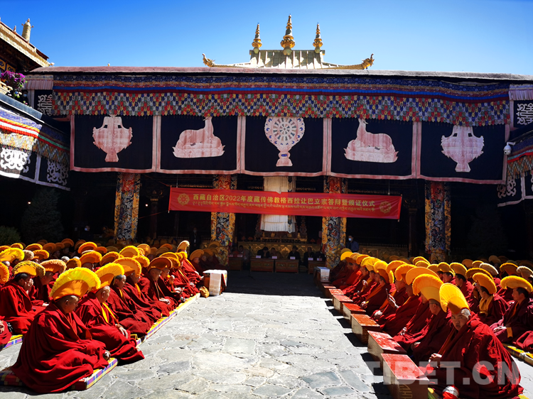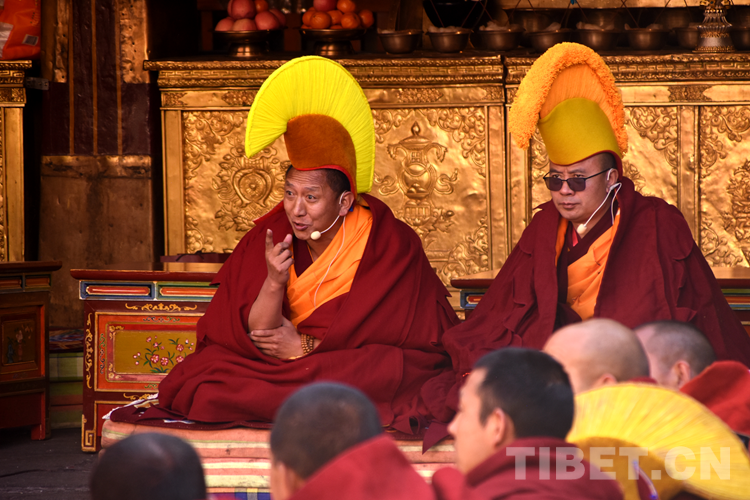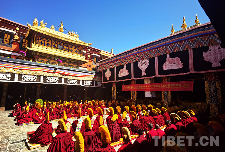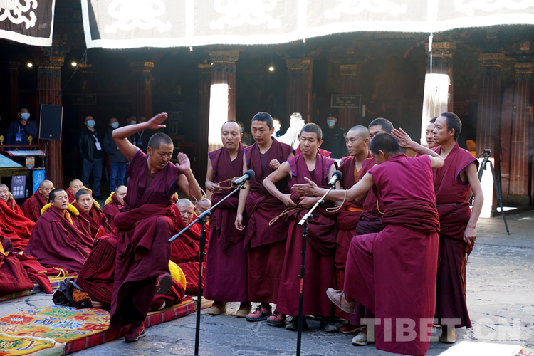 圖為西藏自治區(qū)2022年度藏傳佛教學(xué)經(jīng)僧人考核晉升格西拉讓巴學(xué)位立宗答辯暨頒證儀式現(xiàn)場(chǎng) 攝影:拉姆