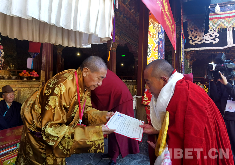 圖為中國(guó)佛教協(xié)會(huì)西藏分會(huì)常務(wù)副會(huì)長(zhǎng)珠康·土登克珠活佛(左)向考僧頒發(fā)學(xué)位證書 攝影:王淑