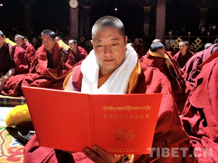 活動(dòng)現(xiàn)場(chǎng),西藏自治區(qū)人民政府副秘書長(zhǎng)馬立柱代表西藏自治區(qū)人民政府向獲得學(xué)位的考僧贈(zèng)送五彩緞、干果、袈裟和禮金;西藏自治區(qū)宗教局副局長(zhǎng)達(dá)娃窮達(dá)向參加答辯活動(dòng)的僧人發(fā)放布施;中國(guó)佛教協(xié)會(huì)西藏分會(huì)常務(wù)副會(huì)長(zhǎng)、西藏佛學(xué)院院長(zhǎng)珠康?土登克珠致賀詞,并代表班禪額爾德尼?確吉杰布會(huì)長(zhǎng)向獲得學(xué)位的考僧獻(xiàn)哈達(dá)、頒發(fā)學(xué)位證書。