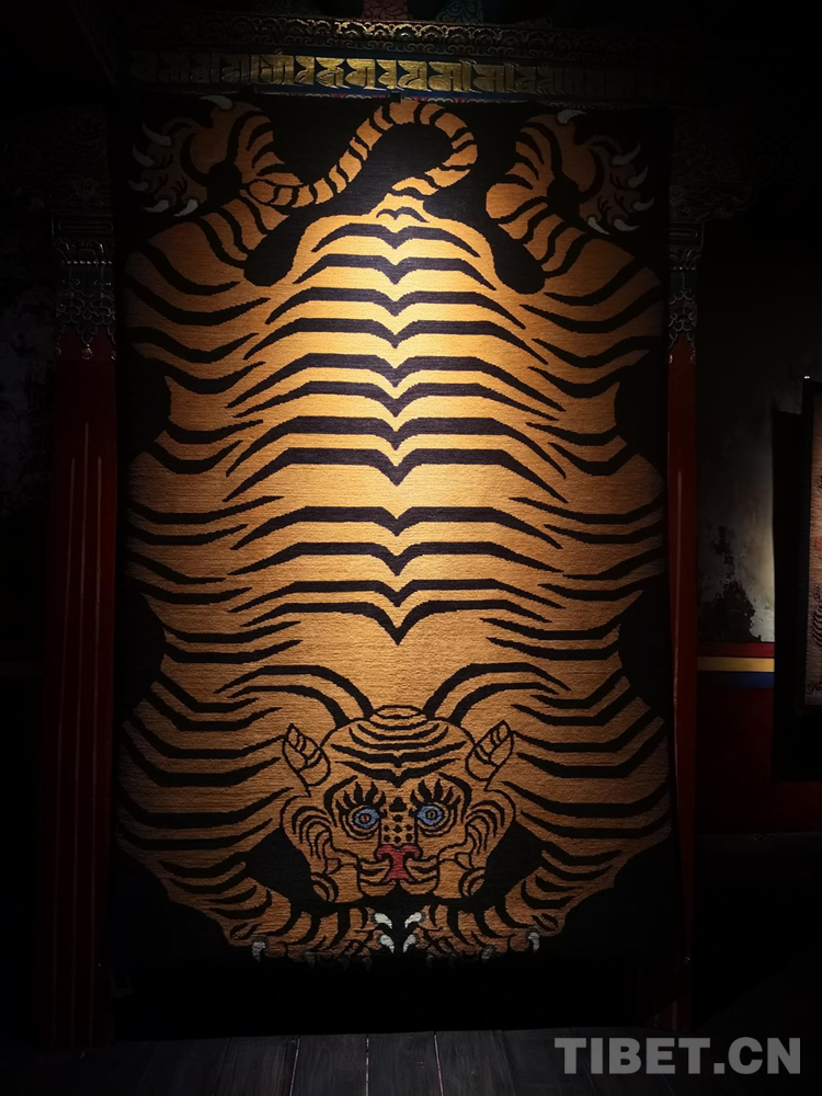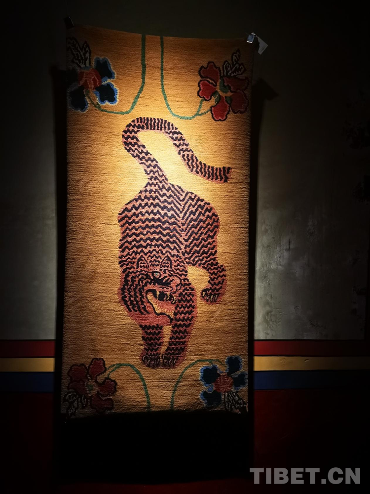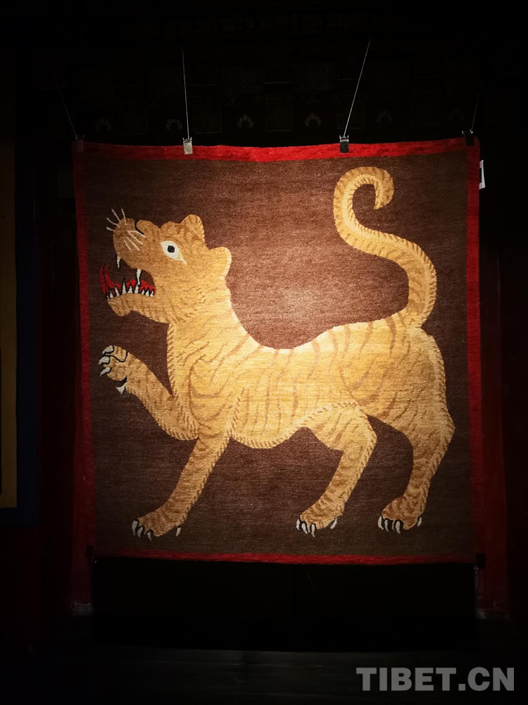 生活在不同地區(qū)的中華民族先民們都不約而同地有著對虎的崇拜和描繪。據(jù)了解,“云從龍,風從虎”在中國古代先秦時期,虎一度與龍并列而成為權(quán)力和力量的象征。根據(jù)相關(guān)文獻記載,早在5000年前,西藏阿里地區(qū)的居住者就將虎皮紋飾等符號刻在巖石上;公元7世紀前后,松贊干布曾頒布《三十六制》,提到“虎皮褂、虎皮裙、虎皮袍”等成為“六勇飾”,只有獲得地位和相當成就的人才能佩戴,虎的圖案也自此融入地毯等西藏織物中。