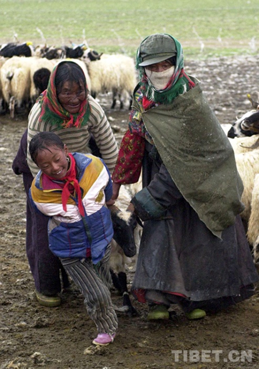 這是嘎措鄉(xiāng)一位小學生利用業(yè)余時間,在幫助村民拽拉不肯挪步的羊只統(tǒng)一去擠奶。這種勞動到年底也可獲得一定的工分收入(唐召明2001年攝)