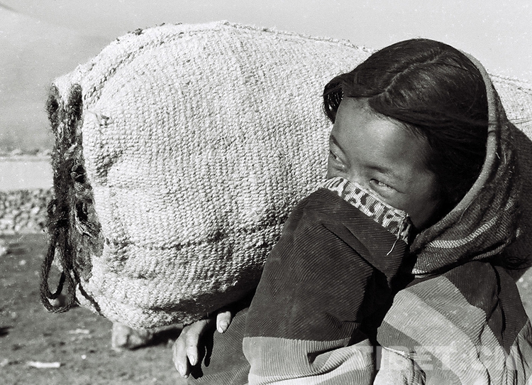 這是一名小學生利用業(yè)余時間撿拾牛糞,然后肩扛裝好的成袋牛糞去交集體作燃料。這種勞動到年底也可獲得一定的工分收入(唐召明1988年攝)
