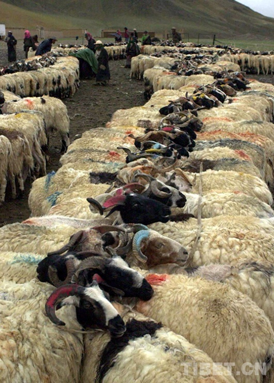 這是嘎措鄉(xiāng)牧人用繩子拴住羊角后,統(tǒng)一待擠羊奶的羊群(唐召明2001年攝)