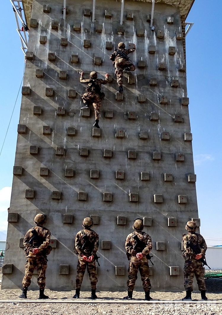 圖為阿里軍分區(qū)某部官兵進(jìn)行攀登訓(xùn)練