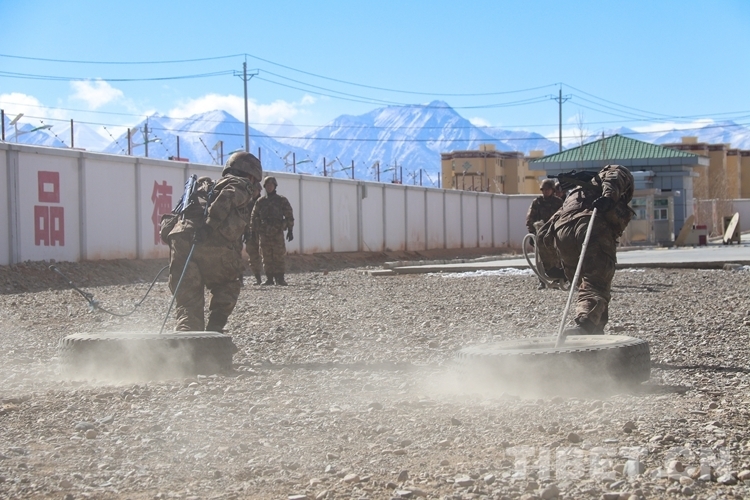 圖為阿里軍分區(qū)某部官兵進(jìn)行拉輪胎訓(xùn)練