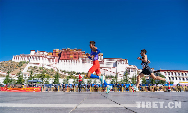 圖為拉薩半程馬拉松比賽中運(yùn)動(dòng)健兒從布達(dá)拉宮前飛奔而過(guò) 攝影:趙耀