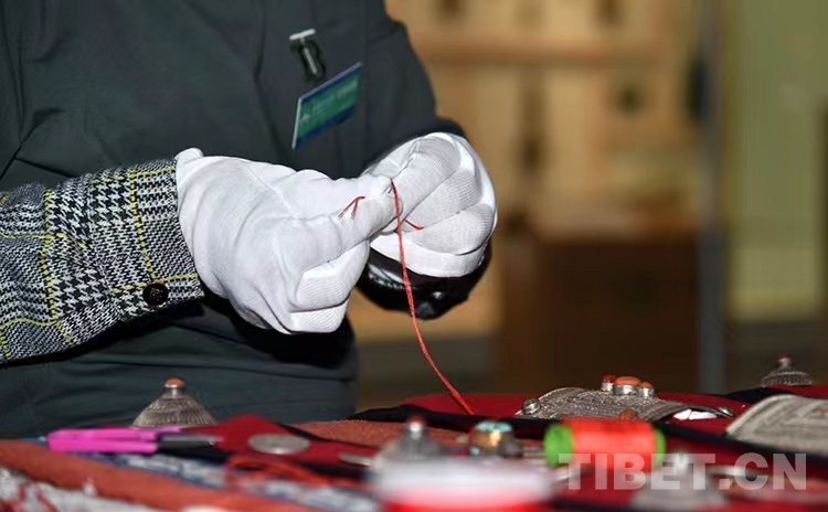 圖為西藏博物館工作人員正在縫制飾品 攝影:王媛媛