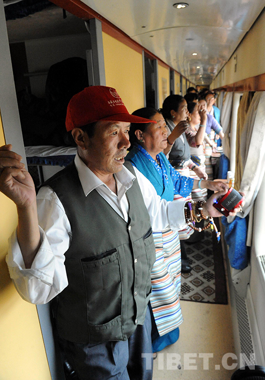 這是乘坐北京至拉薩列車的藏族旅客,在京藏列車上載歌載舞活動(dòng)筋骨(唐召明2014年5月28日攝)