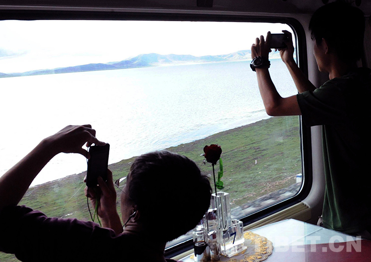 這是京藏列車在通過(guò)錯(cuò)那湖時(shí),旅客們紛紛用手機(jī)拍攝美景(唐召明2012年8月12日攝)