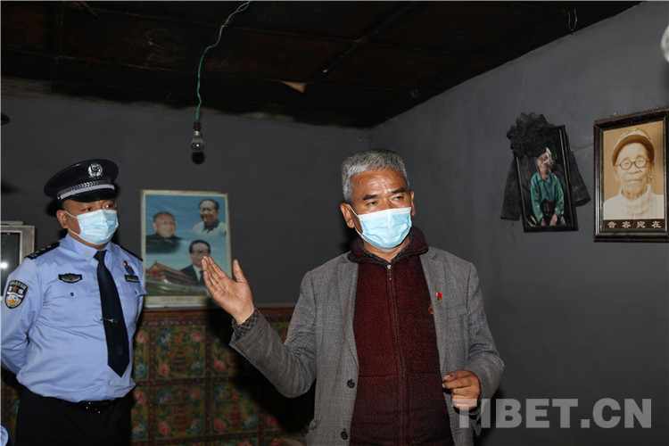 圖為邦村村長羅布在老阿媽故居向邊檢站民警講述國旗老阿媽事跡 攝影:尼瑪?shù)┰?/p>