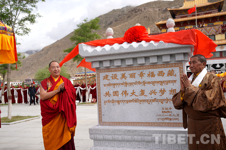 圖為班禪為西藏佛學院“建設(shè)美麗幸福西藏 共圓偉大復興夢想”石碑揭牌 攝影:王淑