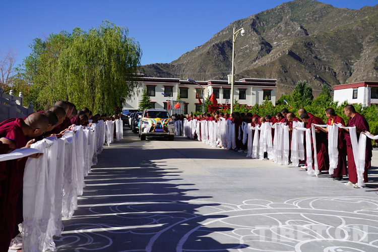 圖為班禪抵達西藏佛學院,西藏佛學院全體師生手捧哈達迎接班禪 攝影:王淑