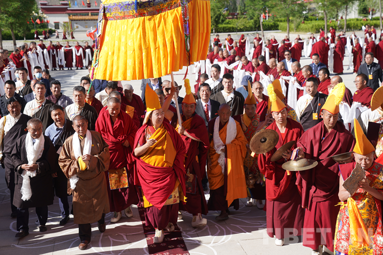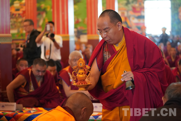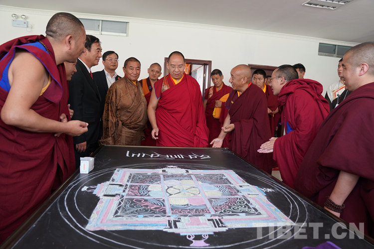 中國西藏網(wǎng)訊 近日,全國政協(xié)常委、中國佛教協(xié)會副會長、中國佛教協(xié)會西藏分會會長班禪額爾德尼?確吉杰布來到位于西藏自治區(qū)拉薩市曲水縣的西藏佛學院考察調(diào)研,為“建設(shè)美麗幸福西藏 共圓偉大復興夢想”石碑揭牌,為學員講經(jīng)授法、進行長壽灌頂,并為僧尼摸頂賜福。