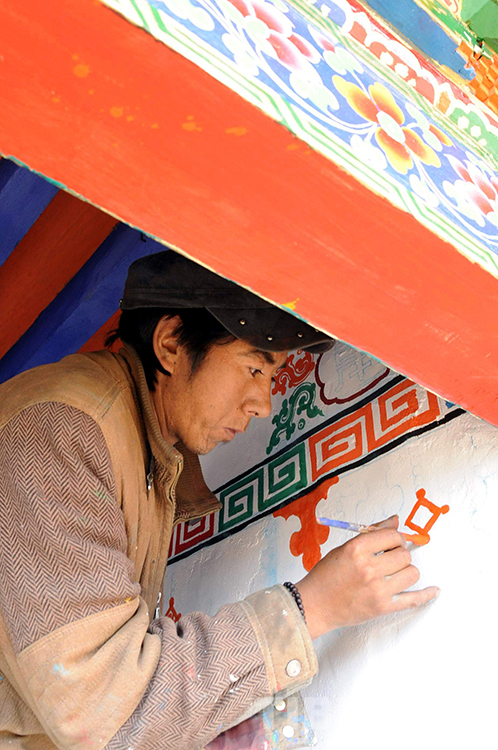 這是尼瑪縣文部鄉(xiāng)南村一戶人家請來畫師為自家安居新房進(jìn)行室內(nèi)彩繪(唐召明2009年攝)