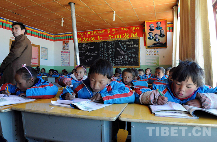 這是那曲縣(現(xiàn)色尼區(qū))羅瑪鎮(zhèn)中心小學(xué)的學(xué)生在窗明幾凈的教室里上課(唐召明2014年4月9日攝)