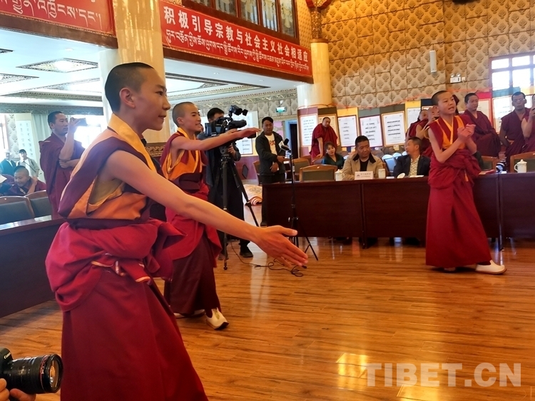 據(jù)了解,與傳統(tǒng)寺廟教育相比,西藏佛學院開設有文化課和佛學兩大體系,天資聰慧的少年活佛們在校期間已經(jīng)開始研習含義深刻、博大精深的《五部大論》《入菩薩行論》等佛教經(jīng)典作品,目前已經(jīng)可以流暢地背誦部分經(jīng)典。在當日的學習成果匯報展示會上,少年活佛們不僅展示了藏漢雙語朗誦、藏漢文書法、英語情景劇等,也為大家?guī)砹恕度肫兴_行論》第一章的背誦展示和辯經(jīng)展示。