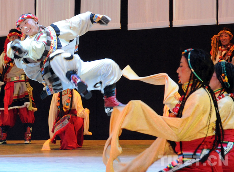 這是班戈縣諧欽民間藝術(shù)團(tuán)的年輕舞蹈演員在家鄉(xiāng)班戈縣城演出時(shí),跳起歡快的傳統(tǒng)舞蹈(唐召明2015年5月21日攝)