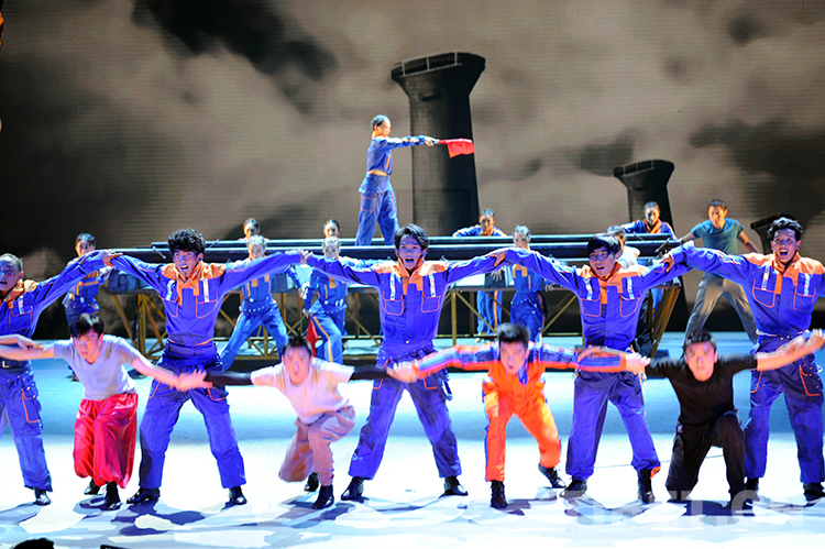 這是班戈縣諧欽民間藝術(shù)團(tuán)的年輕舞蹈演員,在北京華北電力大學(xué)禮堂彩排劇中修筑青藏鐵路的場景(唐召明2015年9月28日攝)
