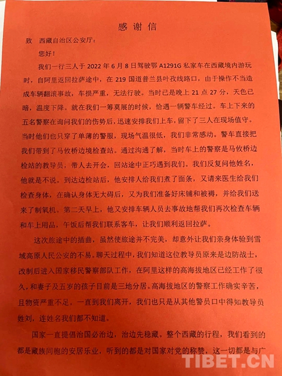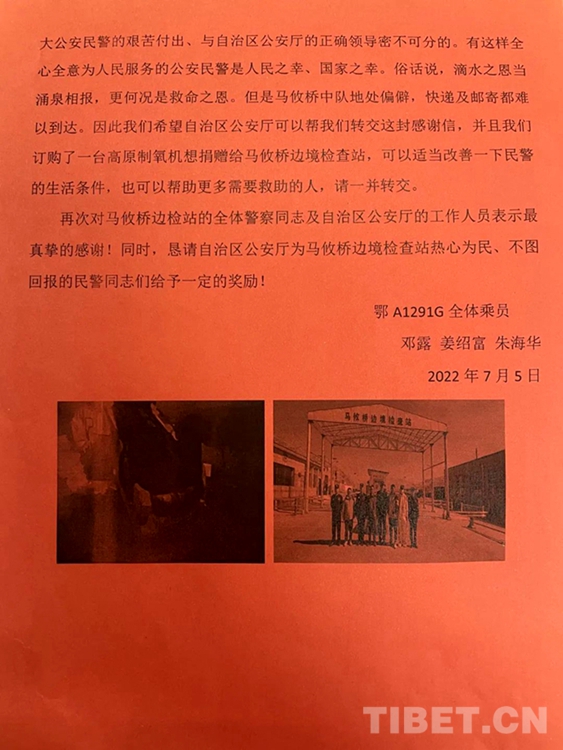 中國西藏網(wǎng)訊 近日,西藏自治區(qū)阿里邊境管理支隊(duì)馬攸橋邊境檢查站(以下簡稱:馬攸橋邊境檢查站)收到了一份署名為“鄂A1291G全體乘員”的包裹,里面包含了一面錦旗,一封感謝信,還有一份特別的禮物。
