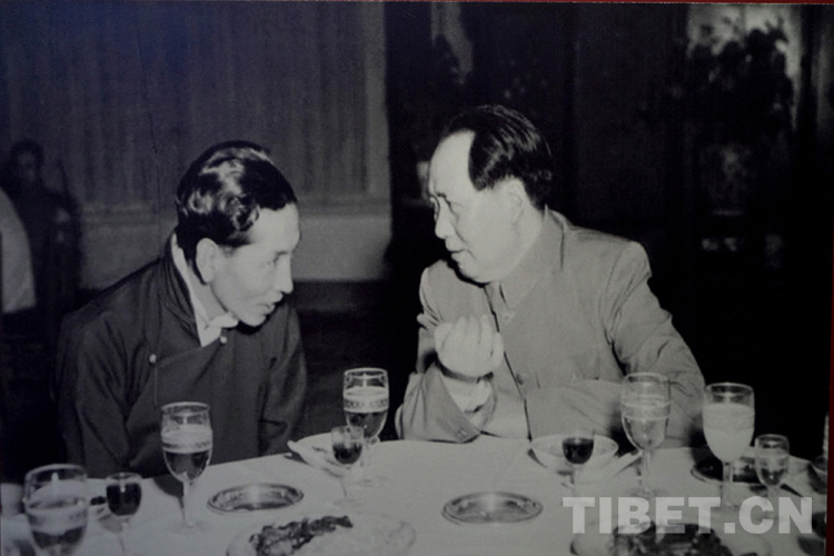 圖為1951年5月24日,毛澤東主席設(shè)宴慶?!吨醒肴嗣裾臀鞑氐胤秸P(guān)于和平解放西藏辦法的協(xié)議》的簽訂。宴會(huì)上,毛主席與阿沛?阿旺晉美(左)親切交談
